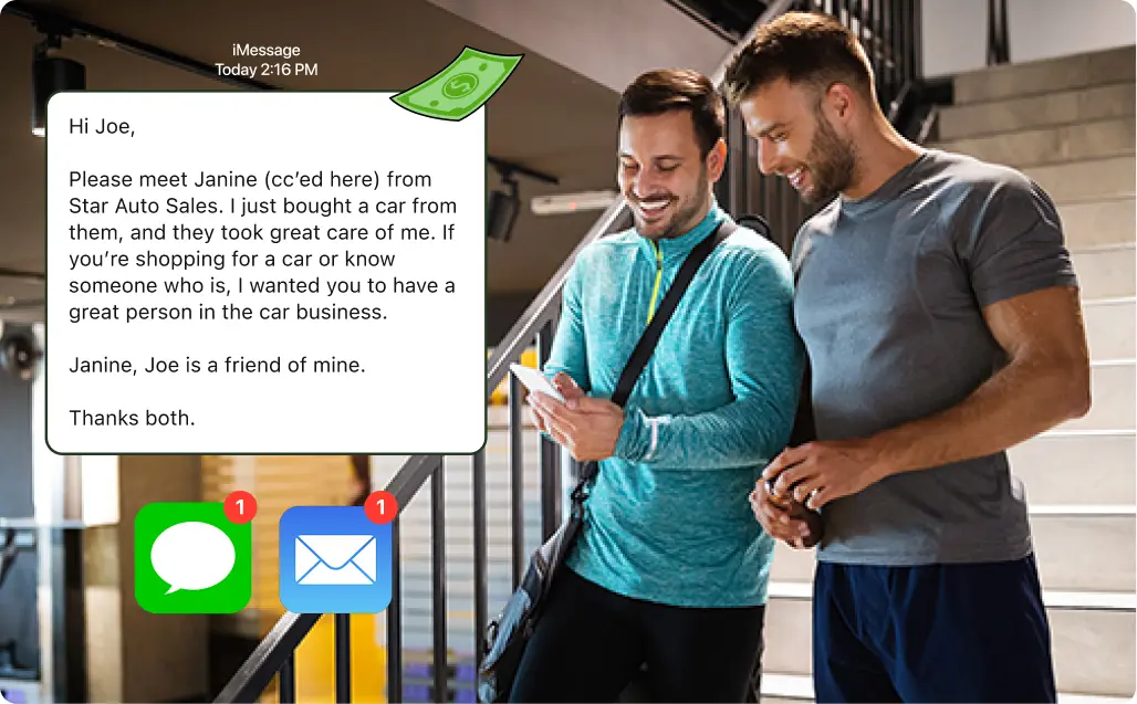 Download our referral mobile app. In 6 seconds, introduce your friends to your favorite salesperson by text. We’ll make sure they are taken care of.